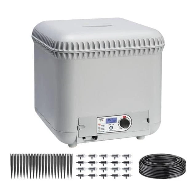 The Claber Oasis Evolution is designed for watering indoor plants for a period of 7 – 28 days. This is an all in one unit, with a 25-litre water tank, 20 drip emitters (for 20 plant pots), and 10 metres supply tube. This is ready to use within minutes, is extremely compact and requires no electrical connection as it runs off of 2x AA batteries. Choose from one of four programs depending on the length of time you want to have automatic watering for – either 7, 14, 21 or 28 days of autonomy.