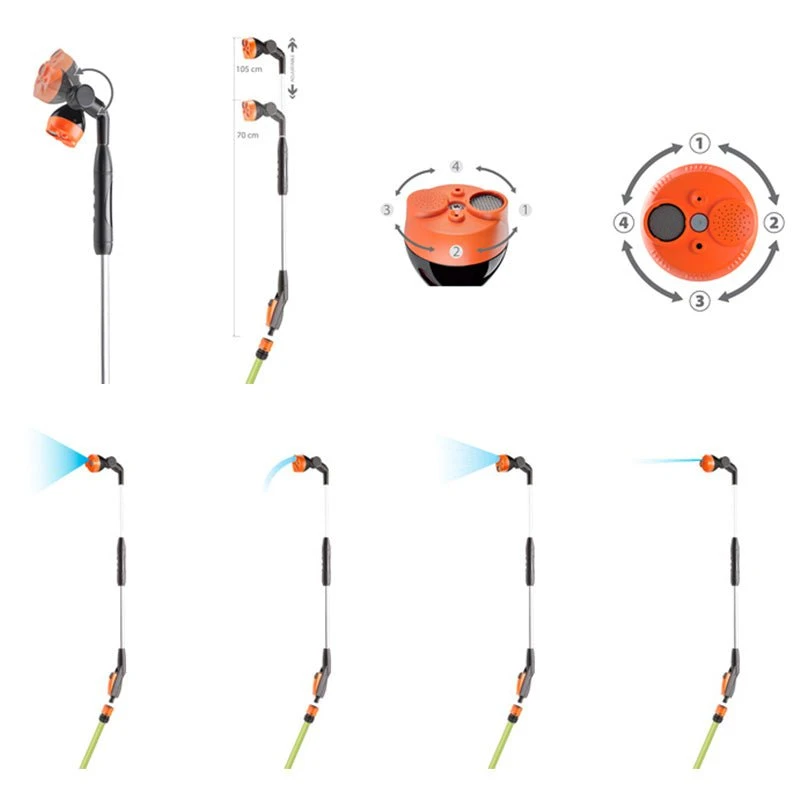 - Multifunction spray gun on an extendable aluminium rod, perfect for reaching tricky areas in the garden.